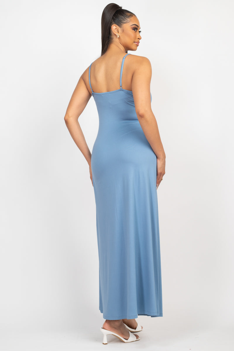 Top: A casual top in a solid color featuring a scoop neckline, adjustable cami straps, sleeveless cut, front slit detail, button-down closure, and a full-length.